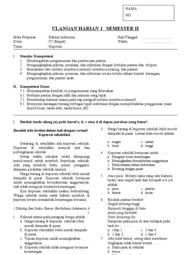 Contoh soal pts mapel bahasa indonesia kelas 4 semester ganjil.